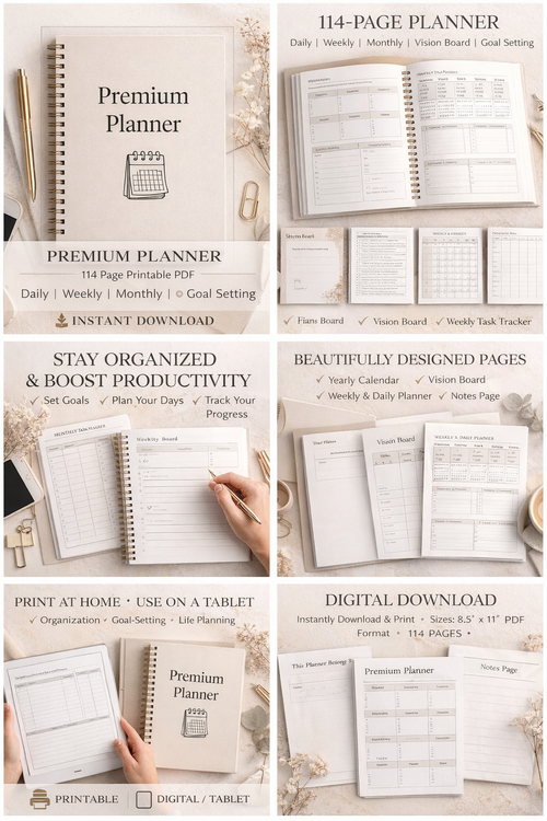 114-Page Printable Planner | Daily, Weekly, Monthly, Vision Board (PDF Download)